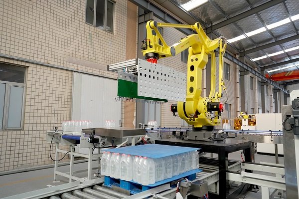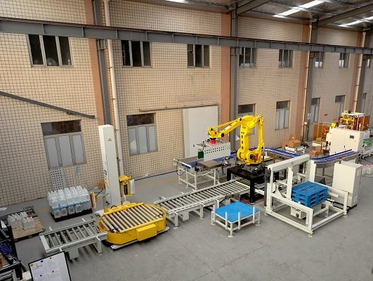 膜包水碼垛纏繞包裝線是由供棧機(jī)、理料線、碼垛機(jī)器人、墊板倉以及在線纏繞機(jī)等設(shè)備組成。該線體常用于礦泉水、飲料、啤酒、瓶裝調(diào)味料等產(chǎn)品碼垛使用。鑒于前端罐裝產(chǎn)品的效率比較高,碼垛機(jī)器人采用庫卡大負(fù)載機(jī)器人,同時(shí)配以復(fù)合式抓手,即可實(shí)現(xiàn)一列產(chǎn)品一起抓取,也可以同時(shí)抓取墊板,占地面積小,成本低。