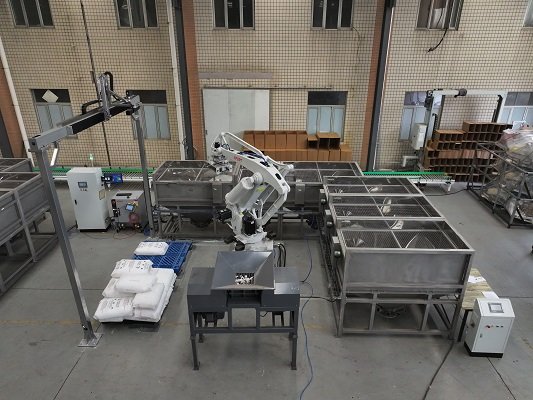 袋子卸垛是目前包裝領(lǐng)域非常常見的一種需求方式,用戶需要對(duì)托盤上的袋子進(jìn)行卸垛,同時(shí)需要將卸下來的袋子進(jìn)行破包,將內(nèi)部物料倒入提前準(zhǔn)備好的料斗里,有可能只有一種物料,有時(shí)也有可能是多種物料按照一定的比例混入料斗中,之后分別輸送到指定位置。而破袋后的袋子,有的需要緩存到其他的料箱中,而有的則需要直接粉碎后,再次回收。